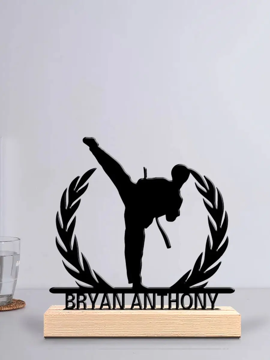 1pc Modern Taekwondo Customized Letter Iron Statue With Wood Base Iron Ornament  Metal Sculpture With Wood Base  Home Table