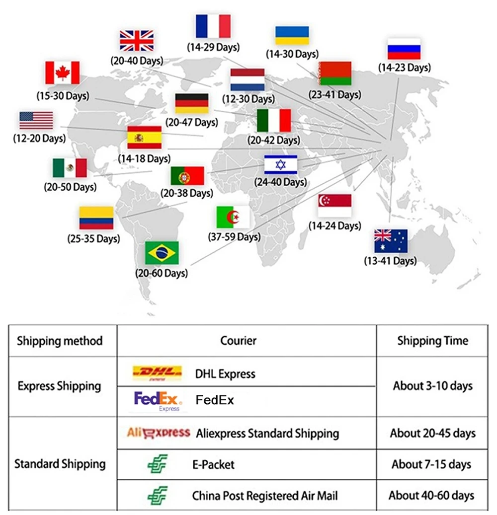 4.We usually use AliExpress official logistics transportation, DHL and UPS, fedex for shipping, which is expected to arrive at your delivery address 5-10 days after placing the order